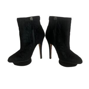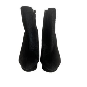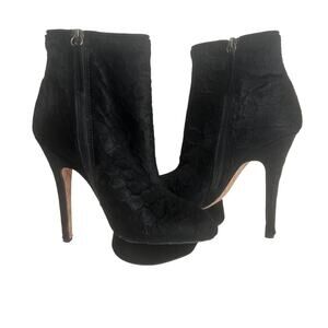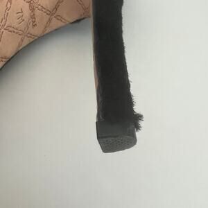 L.A.M.B. Gwen Stafani Noss Mid Calf black fur embossed heel booties.