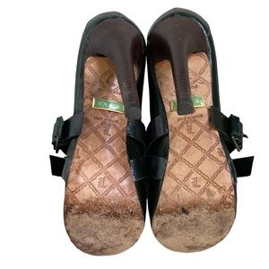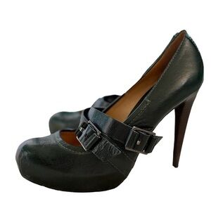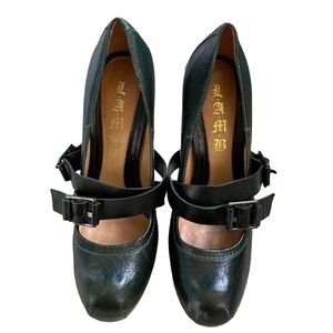 Pre-Owned L.A.M.B Women’s Size 8.5 Finsbury Dark Green Leather Mary Jane Buckle Hidden Platform Heels.