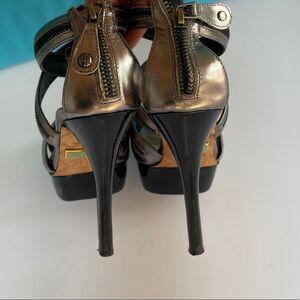 Zipper closure at the back of heel, the right zipper will need to be fixed