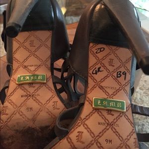 L.A.M.B strappy grey heels w/ blue flower. Sz 9