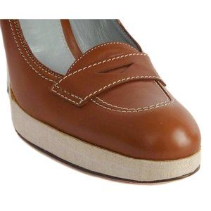 Gorgeous Lambertson Truex brown cognac leather rounded toe penny loafer heels with cream linen platform & wrapped chunky heel. Leather lining & sole. Padded interior suede heel grips.