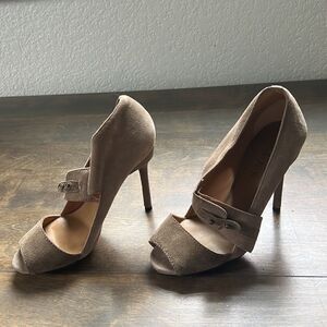 In very good condition ,  sube just tiny little fuzzy part  in the front of a heel see last Pict rest is good , This model of heeled shoes by L.A.M.B. will provide you with comfort and stability in every step you take. Feel comfortable in these strapped open toe suede heels and forget about sore feet!