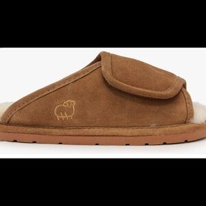 These slippers feature a cow suede outer, 100% Australian sheepskin lining, flexible rubber outsole, and adjustable band. These slippers are part of the Lamo's Luxury Collection.
