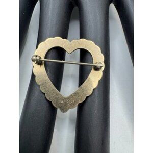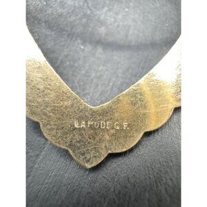 Signed by the brand Lamode, this yellow gold filled brooch features a heart shape design that exudes love and elegance.