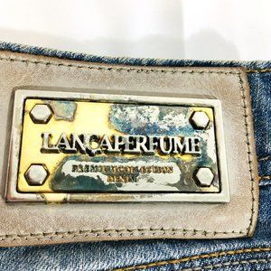 LANCA PERFUME WOMEN SZ 36 DENIM DISTRESSED SHORTS 2” INSEAM ZIP SIDE VENTS LOGO