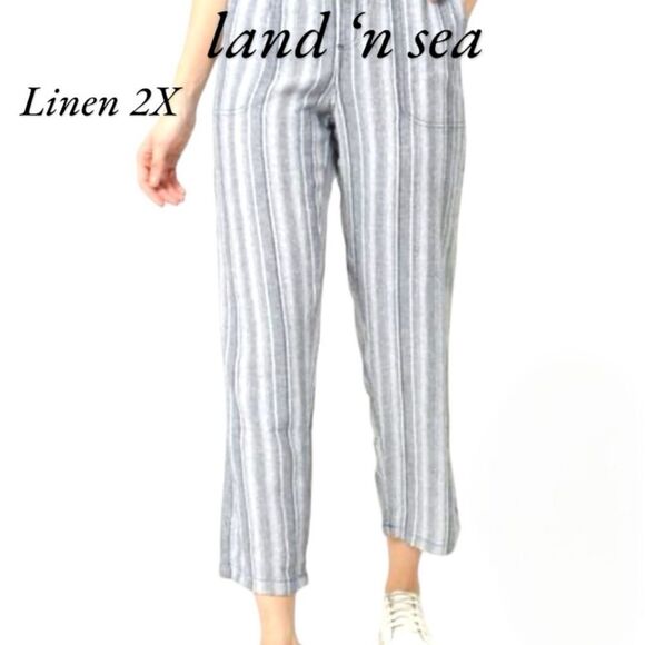 LAND N SEA PANTS WOMEN’S MEDIUM STRIPE CREAM BLUE BROWN 55% LINEN BLEND.