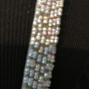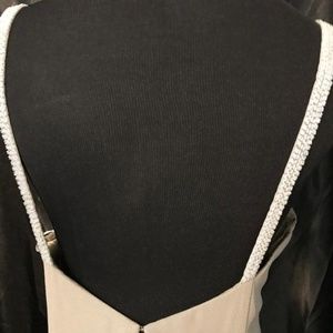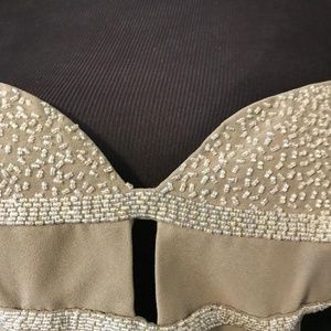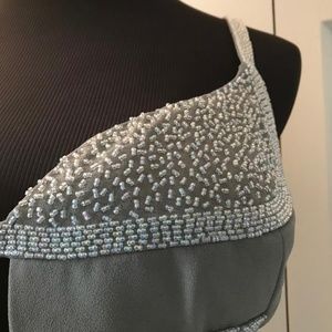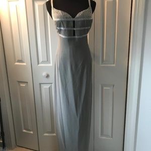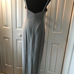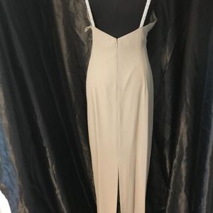 full length formal dress with accentuating beading at bodice. Beaded spaghetti straps two small keyholes in the middle of the bust. Little low back with zipper closure & long slit at the back