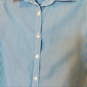 This is a gently used women's Lands' End blue and white striped Broadcloth button down shirt.