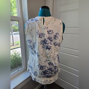 LANDS' END CANVAS SLEEVELESS BLOUSE BEIGE BLUE FLORAL WATERCOLOR WOMEN 8 TANK
