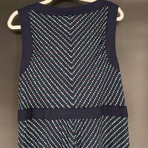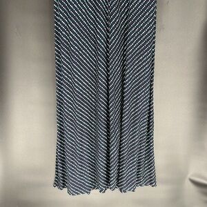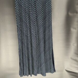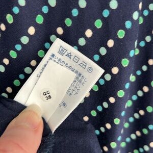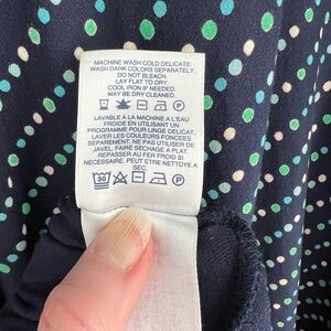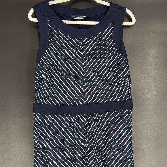 LANDS’ END LONG DRESS SIZE L/P 14-16 NEW WITHOUT TAGS, NAVY BLUE WITH GREEN AND WHITE POLKA DOTS, DRESS SLIPS OVERHEAD AND HAS EXCELLENT STRETCH. WELL MADE