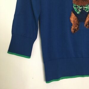 Lands’ End Harbor Blue Sweater with Scottish Terrier Motif. Pullover. 3/4 sleeves with ribbing at cuffs and hem. Crewneck. Hits at hip. 100% Supima Cotton.