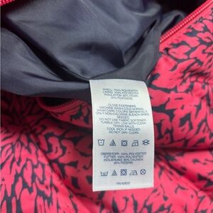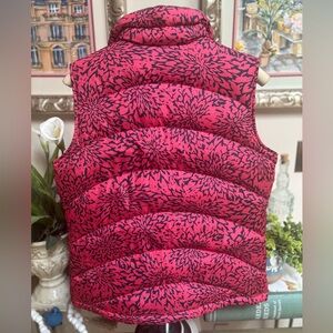 Vibrant coral and navy blue patterned puffer vest. Lightweight and stylish. Ideal for layering. Features 2 front pockets, zip - up, quilted and down filled. Great for any of your outdoor activities. Measurements 20.5” ptp, 25.5” length