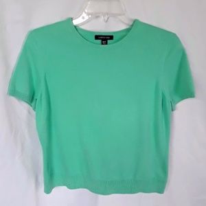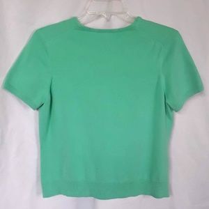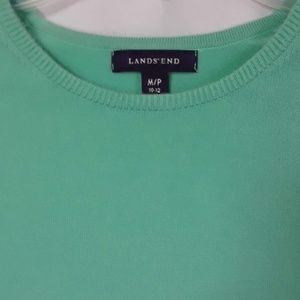 Lands' End mint green pullover sweater shell with short sleeves and scoop neck. The soft, light weight sweater has a cute rib knit trim on sleeves, neckline and waist. Tag Size: M / P (10/12). Chest 37". Good Overall Condition. No holes, rips or stains. Moderately faded from a couple of washings, as cotton will do. Non-Smoking Home. NOTE: I have a lot of mix and match sweaters! I will give you a great deal if you buy 2 or more! 96% Supima Cotton, 3% Nylon, 1% Lycra