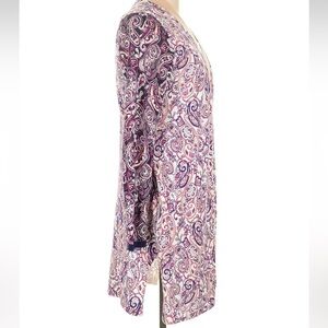 LANDS' END Long Open Front Cardigan Sweater Ivory Paisley Purple Size Med 10-12