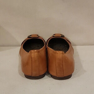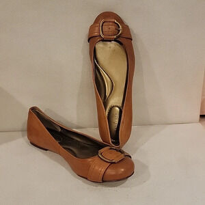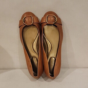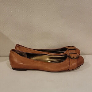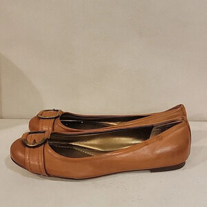 Lands' End medium brown leather ballet flats. There is a decorative buckle on the toe of the shoes. The shoes are in great condition except for a small mark on the left shoe, at the heel area. Please see all pictures.