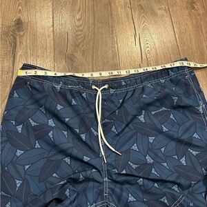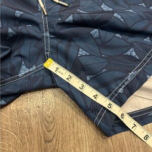 • Features: Mesh lined swim trunks with pockets at hips and small inside pocket. Elastic waist with drawstring closure. Blue tropical leave pattern