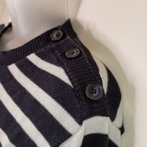 The navy blue and white striped sweater features horizontal stripes that alternate between navy blue and white, creating a visually appealing and nautical-inspired design. The round neckline is simple yet elegant, adding to the sweater's overall versatility.
