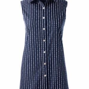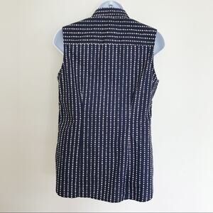 Discover the perfect blend of style and convenience with this navy and pink polka dot sleeveless shirt from Lands' End. The no-iron finish ensures a polished look, while the vertical polka dots add a touch of whimsy. It falls to the mid-hip and features refined details with clean-finished seams. Ideal for layering under a cardigan or blazer.