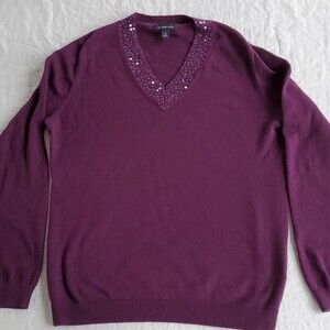 V-neck sweater with sequin trim around neckline. Rich eggplant color and nice and soft. 95% cotton/5% cashmere. Size S (6-8). Can be hand washed. Banded sleeves and bottom. Preowned in excellent condition. Color best reflected in main photo (close up of trim is lighter than actual color).