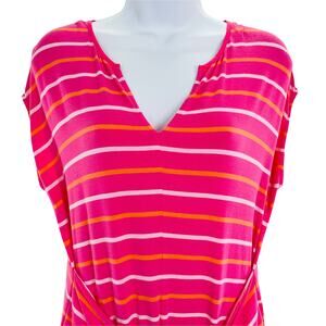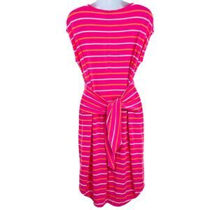 LAND'S END Pink Orange Striped Knit Dress Cap Sleeve Tie Waist Split V-Neck