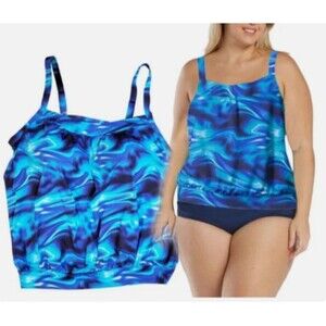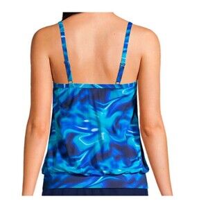 The Lands' End swimsuit top in size 6 DDD features a stylish electric blue swirl pattern, wide straps, and a comfortable tankini style. Made from a blend of nylon and spandex, this blouson tankini top by Lands' End offers built-in bra support, padding, and adjustable straps for a perfect fit.