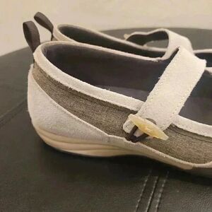 LANDS' END WOMEN'S NATURETEX 70 NATURAL CANVAS NUBUCK SHOES W/STRAP EUC sz 7B White & Gray, Button Closure, Flat, Leather & Cloth