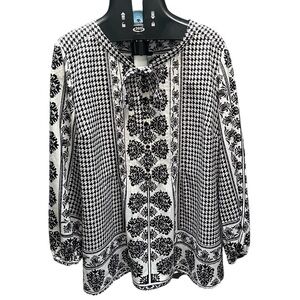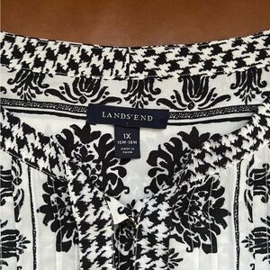 LANDS' END Black and White Floral Houndstooth & Border Print Silky Long Sleeve Blouse Size 1X in excellent condition!