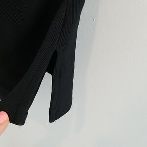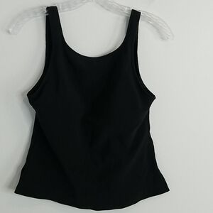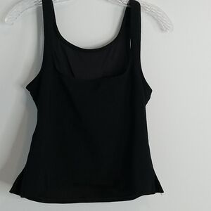 Lands End Black Tankini swimsuit top size 10. Push up padded cups have been sewn in (was not purchased this way). The padding is not removable. The top is a textured, ribbed material with side slits. Slimming. Modest neckline. Shoulder to hem 20.5", Pit to pit 16" will stretch larger. 86% nylon 14% lycra spandex.