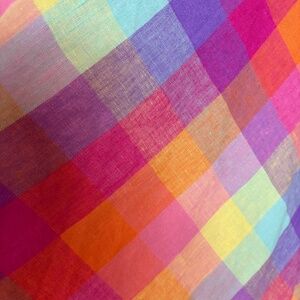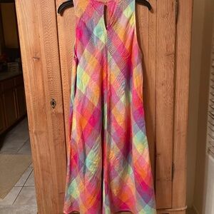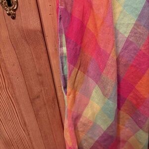 LAND’S END Multicolor Linen Dress, Size M (10-12) Tall. Gorgeous vibrant plaid that flares out from the top into a roomy A-frame shape. With side seam POCKETS and slightly halter cut shoulders. Measures 20” pit to pit when laid flat, but easily stretches to 21-½” because it’s cut on the bias. Measures approx. 43-½” shoulder to hem. Very forgiving size and shape. From a smoke-free home.