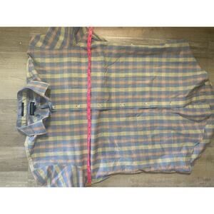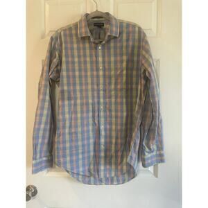 LAND'S END Men's Tailored Fit No Iron Twill Long Sleeve Shirt. Size 16x35. No Iron finish makes this all-cotton shirt a breeze to wash. Front pocket. Color - Chambray Blue, Yellow & Peach Plaid.