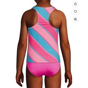 The Lands' End striped blue & pink tankini swim top in girl's size large (10-12) is a vibrant and stylish choice for young swimmers. Made from a comfortable blend of polyester and spandex, this tankini features a flattering tank style with a mild compression level for a secure fit. The colorful striped pattern and lining add a fun and playful touch to this machine washable swim top, making it a must-have for any girl's swimwear collection. With a lightweight and stretchy design, this tankini from Lands' End is perfect for both summer fun and everyday wear.