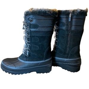 LANDSEND Black Hillary Snow Boots Rugged Warm Winter Faux Fur Trimmed Side Zip