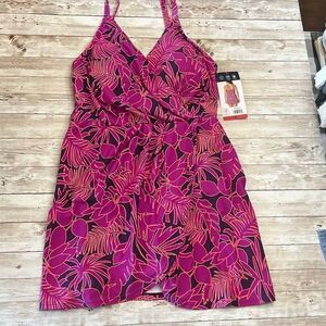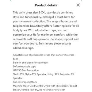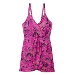 This swim dress seamlessly combines style and functionality, making it a must-have for your swimwear collection. The wrap silhouette and tulip hemline beautifully offers flattering look for all body types. With adjustable straps, you can customize your fit for maximum comfort, while the removable soft cups provide the shape, support and comfort you desire. Built-in one piece ensures added coverage.