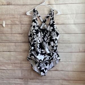 EXCELLENT CONDITION LANDS END ONE PIECE SWIMSUIT IN BLACK AND WHITE FLORAL PRINT