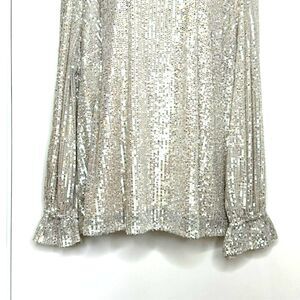 Perfect for the upcoming holidays or an evening out, wear with a skirt, dress pants or jeans, easily dressed up or down. All over champagne taupe beige sequin top featuring, long sleeves, mock neck, 2 button keyhole back, and fully lined. Made of hand washable polyester and 5% spandex.