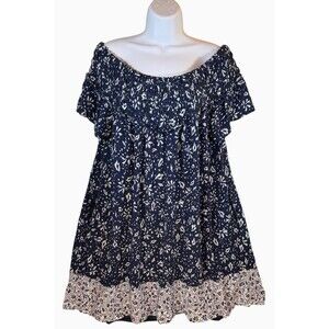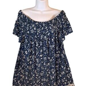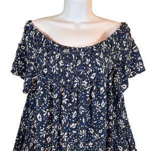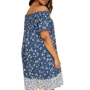 LANE BRYANT Dress 14/16 Blue Floral Smocked Off Shoulder Lined Gauzy Boho Chic