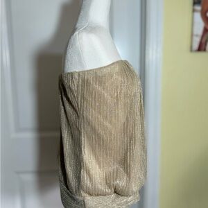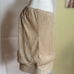 This shirt is a real Showstopper! Gold shimmer with an elastic strapless band on top. Perfect for under a blazer or with a nice pair of jeans!