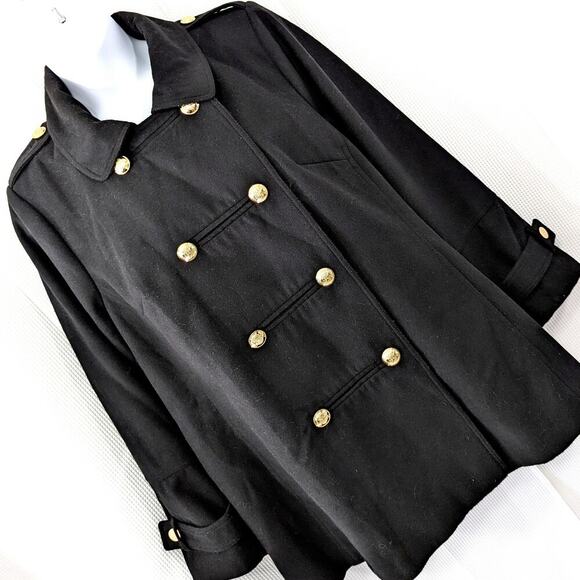 This fabulously luxe take on the navy peacoat is definitely admiralty cool! In rich, saturated black, this coat, jacket, features a fancy double breasted front, with large gold insignia buttons! Epaulettes at the shoulder, belted waist detail, and fully lined in black poly satin with red trim! Hidden front pockets, as well! Back belt detail, also with gold insignia buttons! This coat rocks, with a touch of a swing cut, to boot! Size 26/28, worn rarely at all! Excellent! Superb EUC Condition! **ABSOLUTELY GUARANTEED CONDITION: EUC MINTY-EXCELLENT TO LIKE-NEW, by Lily @HauteClub!*** *Measurements always available on request!*
