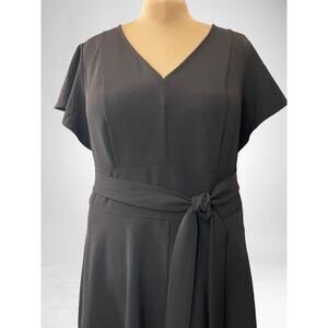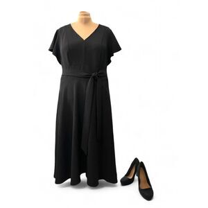 V-neck. Short sleeves. Pockets. Covered elastic waist. Matching self-tie belt. High-low hem. Princess seams. Hidden back zipper. Excellent condition!!