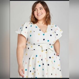 comfy fabric and flattering flare. The super-fun polka dot print and flowy high-low hem of this style make it perfect for cocktail parties and banquets. V-neck. Short flutter sleeves. Self-tie belt and loops at banded waist. Princess seam provide shape and the perfect fit. Pockets. High-low hem. Hidden back zipper with hook-and-eye closure. FABRIC: A soft, comfy woven crepe fabric that acts and feels like a knit with super-flattering stretch.