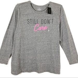 LANE BRYANT GRAY, LONG SLEEVE, STILL DON’T CARE TEE SHIRT. NEW WITH TAGS. 50% POLYESTER 38% COTTON 12% RAYON