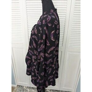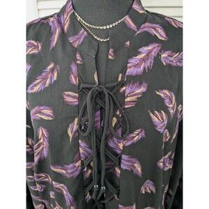 This beautiful Lane Bryant peplum top is perfect for any season! The black, purple, and gold feather pattern adds a touch of boho chic to this plus size blouse. The long sleeves and lace-up neckline make it easy to wear and it comes in a size 22. The blouse is made of polyester with a rayon fabric type and is machine washable for easy care. It has a regular fit and is great for any casual occasion. The ruffle, gold shimmer, and lace-up accents add a unique touch to this basic style blouse. This top is perfect for winter, summer, fall, and spring.