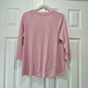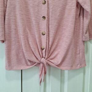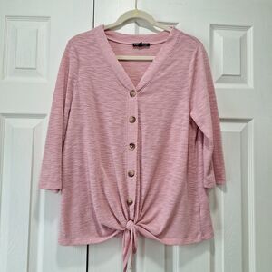 Textured knit with v-neck, front buttons, 3/4 sleeves, and tie-front detail.