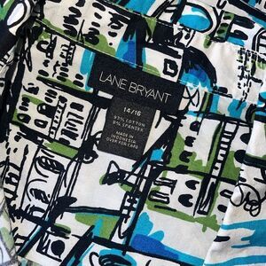 LANE BRYANT XL 14/16 WHITE Blue Green CITYSCAPE BUTTON DOWN SHIRT LONG SLEEVE New Condition