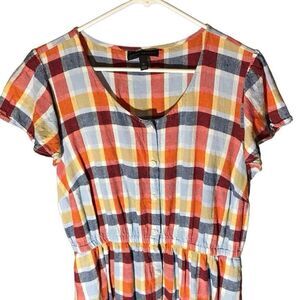This beautiful Lane Bryant dress in size 14 is perfect for any occasion, from travel to weddings, parties, and workwear. The multicolor check pattern and button front closure make it both stylish and practical, while the rayon and linen material provide comfort and breathability. The short sleeves and midi length add a touch of elegance, while the fit & flare style flatters any body type. The dress also features pockets for added convenience. This pre-owned item is in excellent condition and ready to be worn.