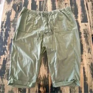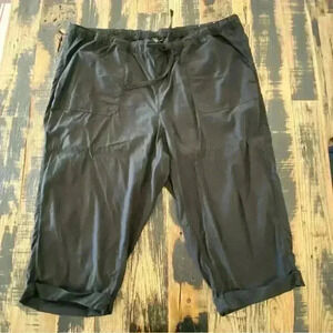 Drawstring waist, large front pockets, back pockets, slightly baggy style, cropped length and folded hem.