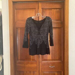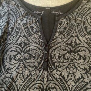 Selling this LANGUAGE Los Angeles Black with a Gray Paisley Pattern Beaded V-neck T Shirt. Cotton. 3 button and small little bead detail. Subtle and cute. 3/4 Sleeve and Size is M. No tags, they're itchy so I cut them out. Measurements below.
