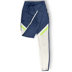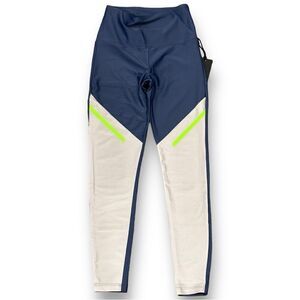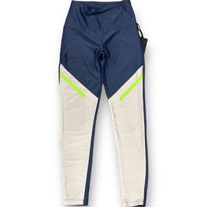 LANSTON Sports Women’s Sports Leggings in the Size XSmall in Blue/Silver Color with Reflective Neon Green stripes.