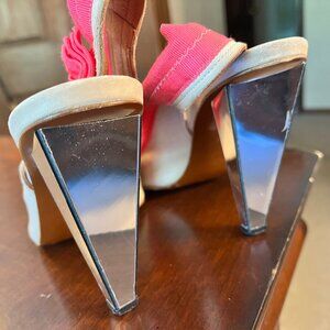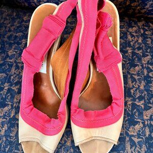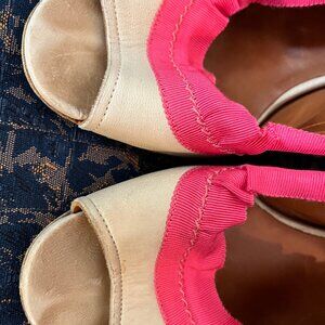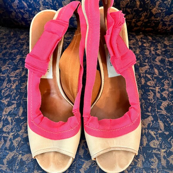 LANVIN Slingback 4 inch high heels from the Ete 2009 collection in beige leather with hot pink canvas grosgrain ribbon trim and detail
