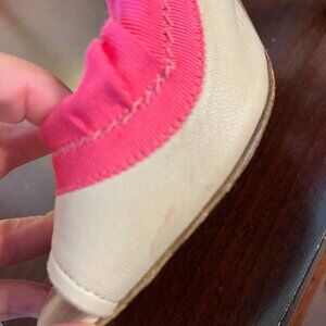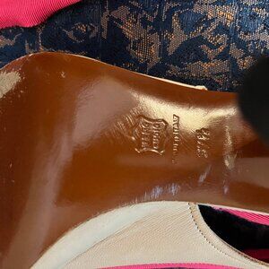 Pre-owned used condition. Bottoms are scuffed and there are some flaws in the mirrored heels. Some black marks on pink ribbon and the beige leather (see photos).